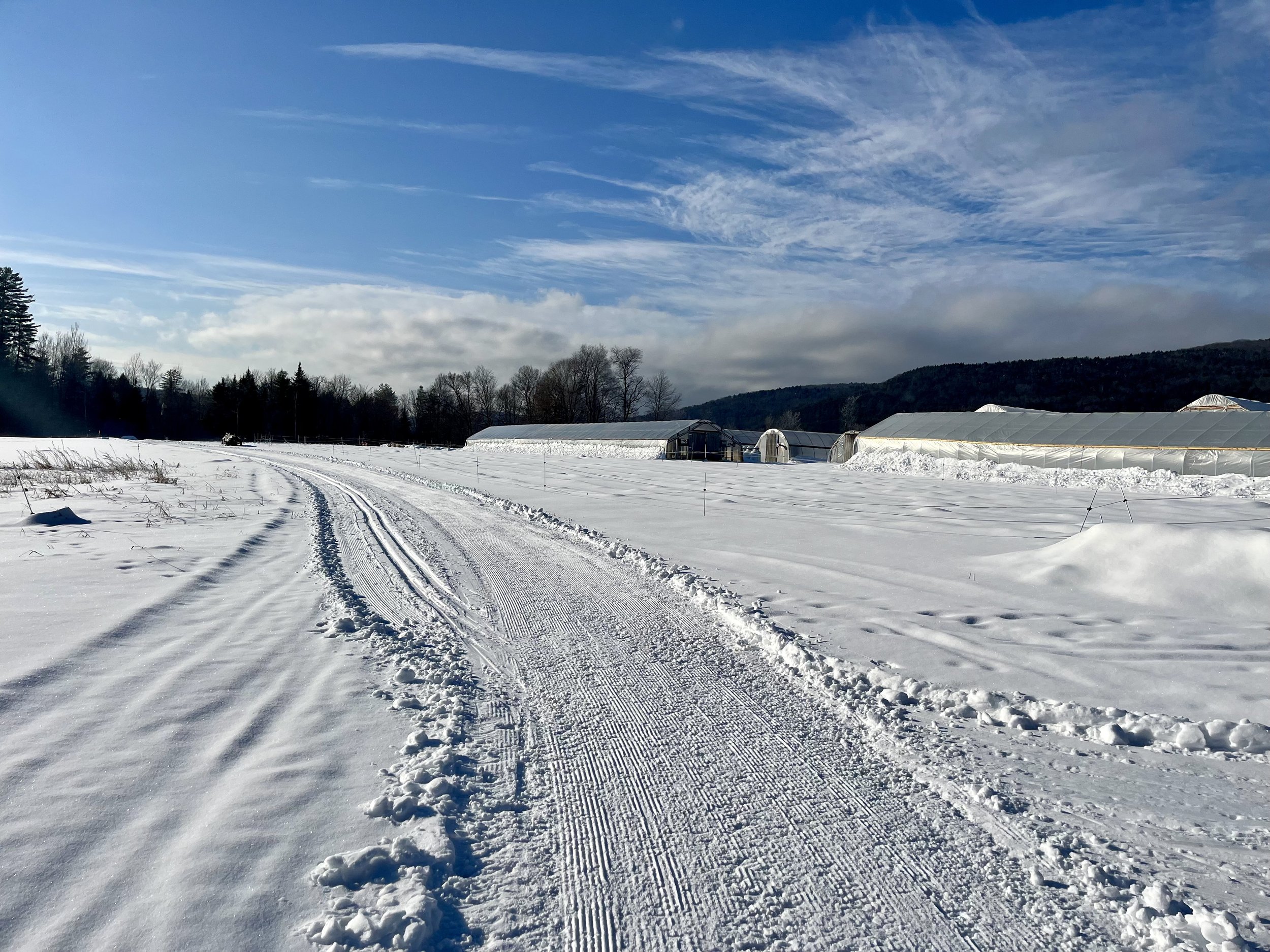 We welcome you to come by and enjoy our walking and skiing trails during the off season! Tim grooms several miles of trails for cross-country skiing around our snow-covered fields. The trails are open for walking when we don't have snow.